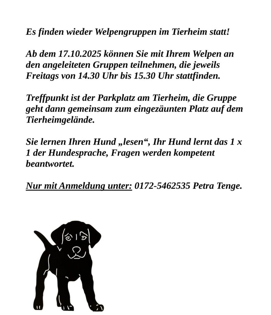 Wieder Welpengruppentraining im Tierheim nur nach Voranmeldung 13.10.2025 15.10.2025 Allgemeines / Termine