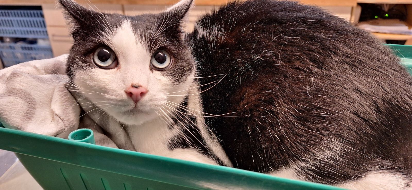 Dieser kastrierte, ungekennzeichnete Kater kam am 22.11. gegen Mittag zu uns ins Tierheim. Er wurde in der Wallstraße auf dem Parkplatz hinter den Altpapiercontainern in der Transportbox (s. Foto) gefunden.