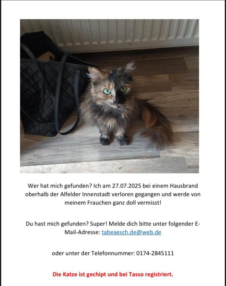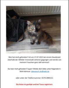 Vermisst – Katze nach Wohnungsbrand in Alfeld im Juli 2025 17.02.2026 17.02.2026 vermisste Tiere Nach einem Hausbrand im Juli 2025 oberhalb der Alfelder Innenstadt wird immer noch diese Katze vermisst. Wer hat sie aufgenommen oder weiß, wo sie sich befindet?