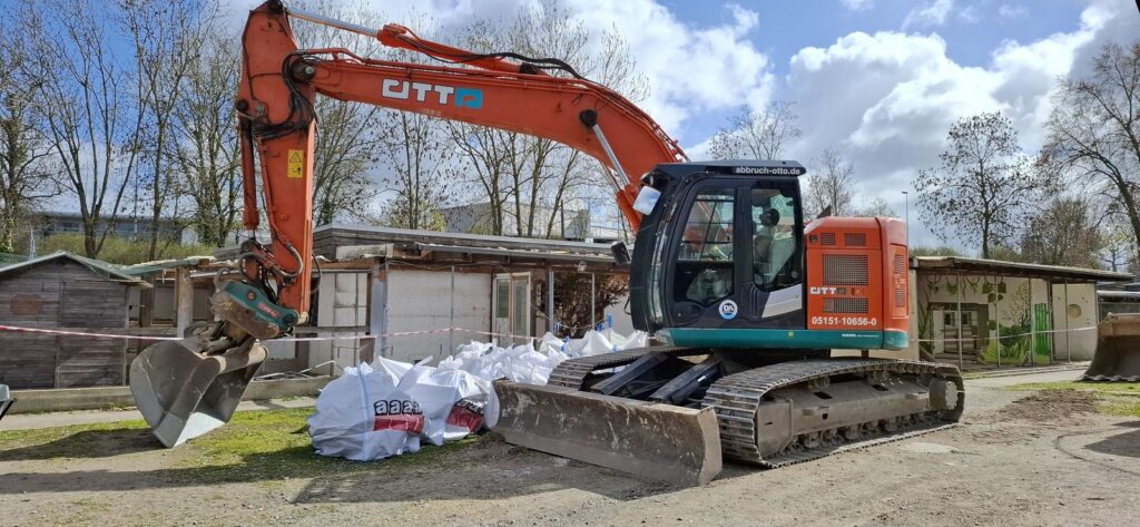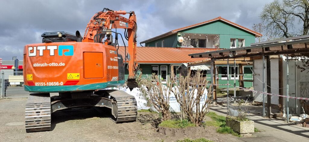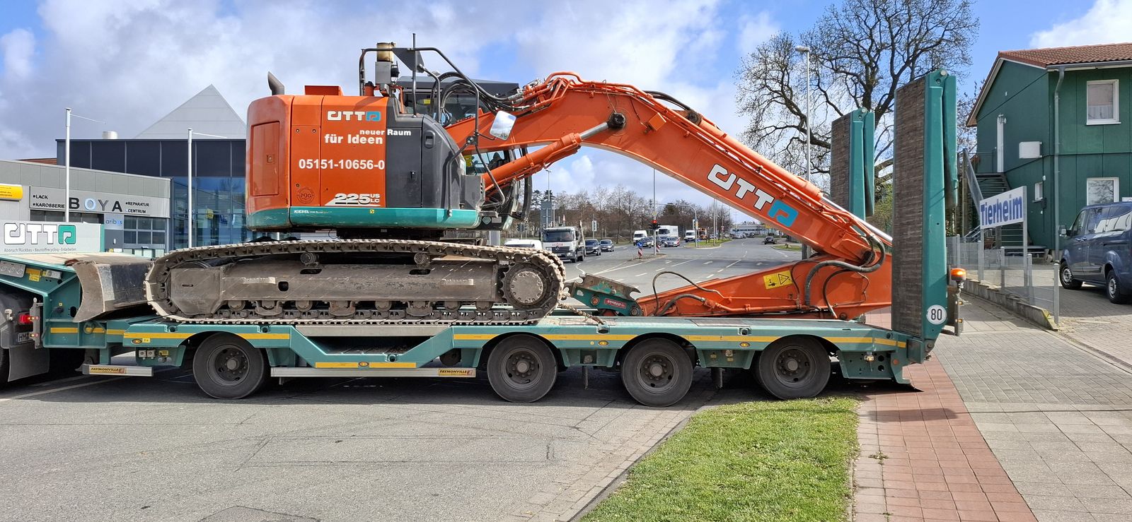 Da die nicht vom Abriss betroffenen Gebäude von der Heizung des Abrissgebäudes versorgt werden und der Winter nicht wirklich gehen möchte, beginnt der Abriss am 30.03. Die Anlieferung des Baggers erfolgte am 27.03. und zeigte bereits jetzt die doch recht beengten Platzverhältnisse auf.