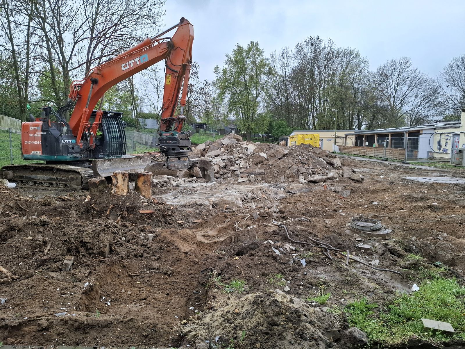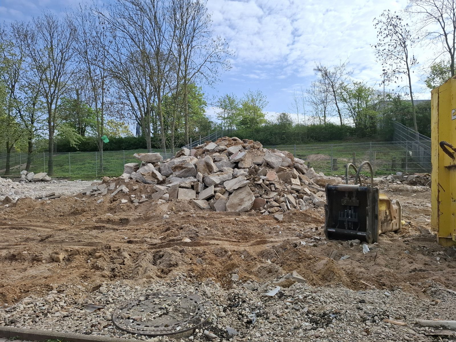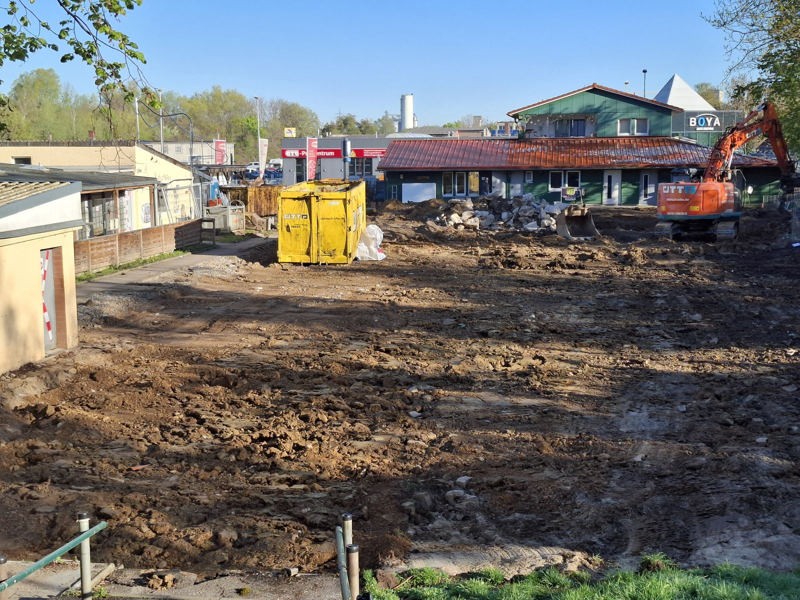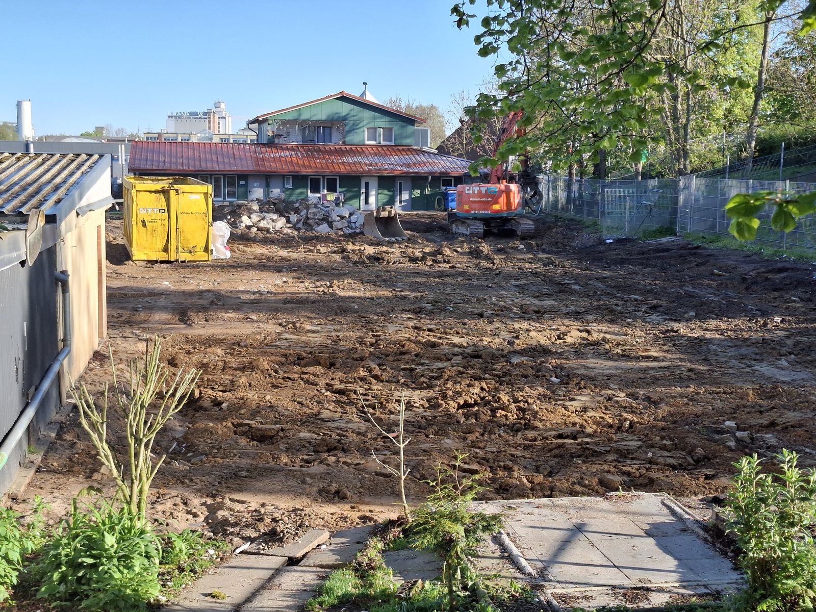 Am heutigen Donnerstag Morgen wurde der Bagger abgeholt, der uns die letzten drei Wochen begleitete. Der fehlende Bagger zeigt uns nun eine riesige frei gewordene Fläche, die ab der nächsten Woche durch ein neues Bauunternehmen für den Neubau vorbereitet wird.