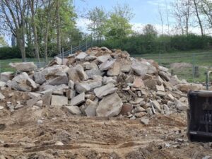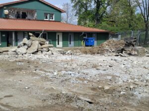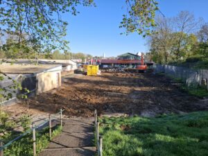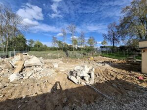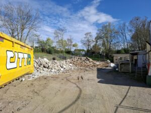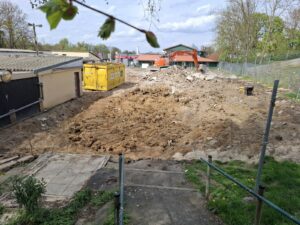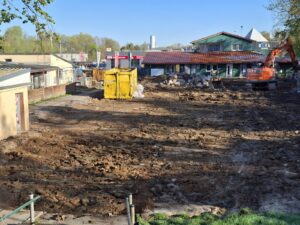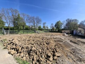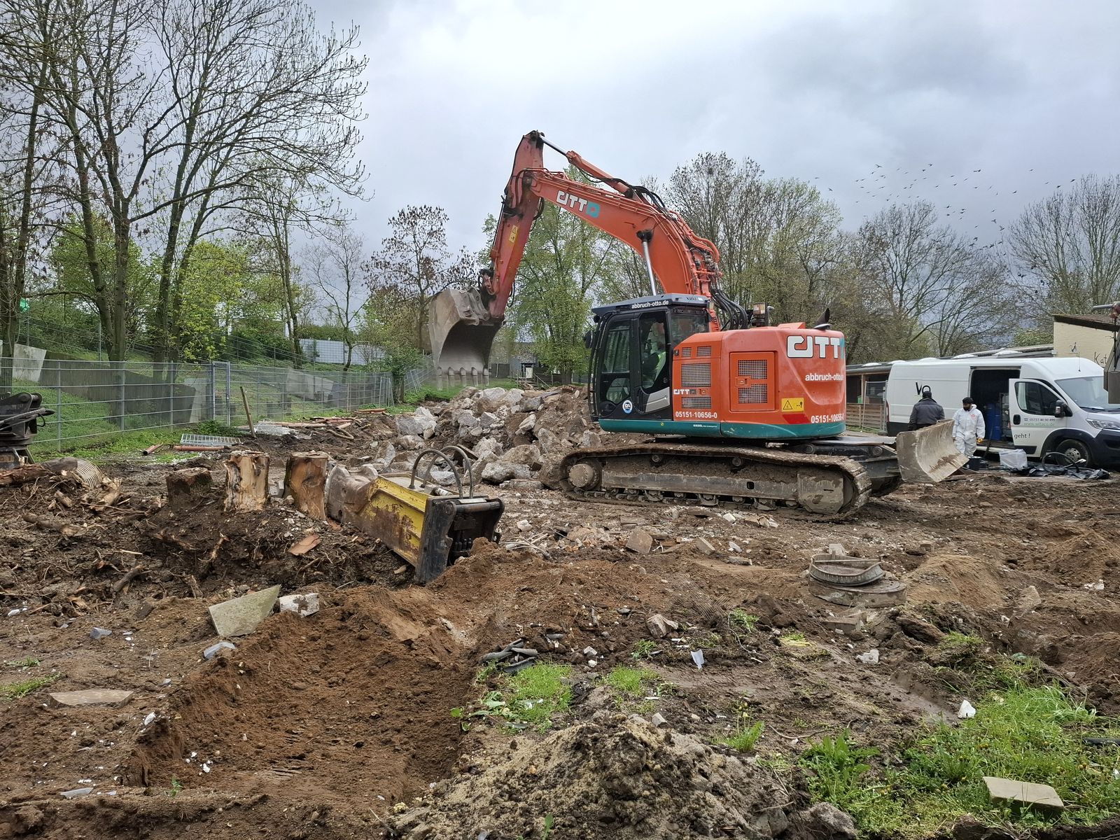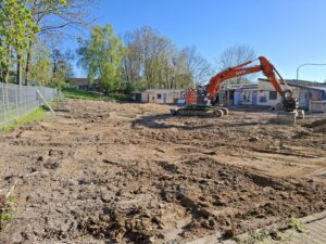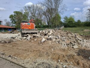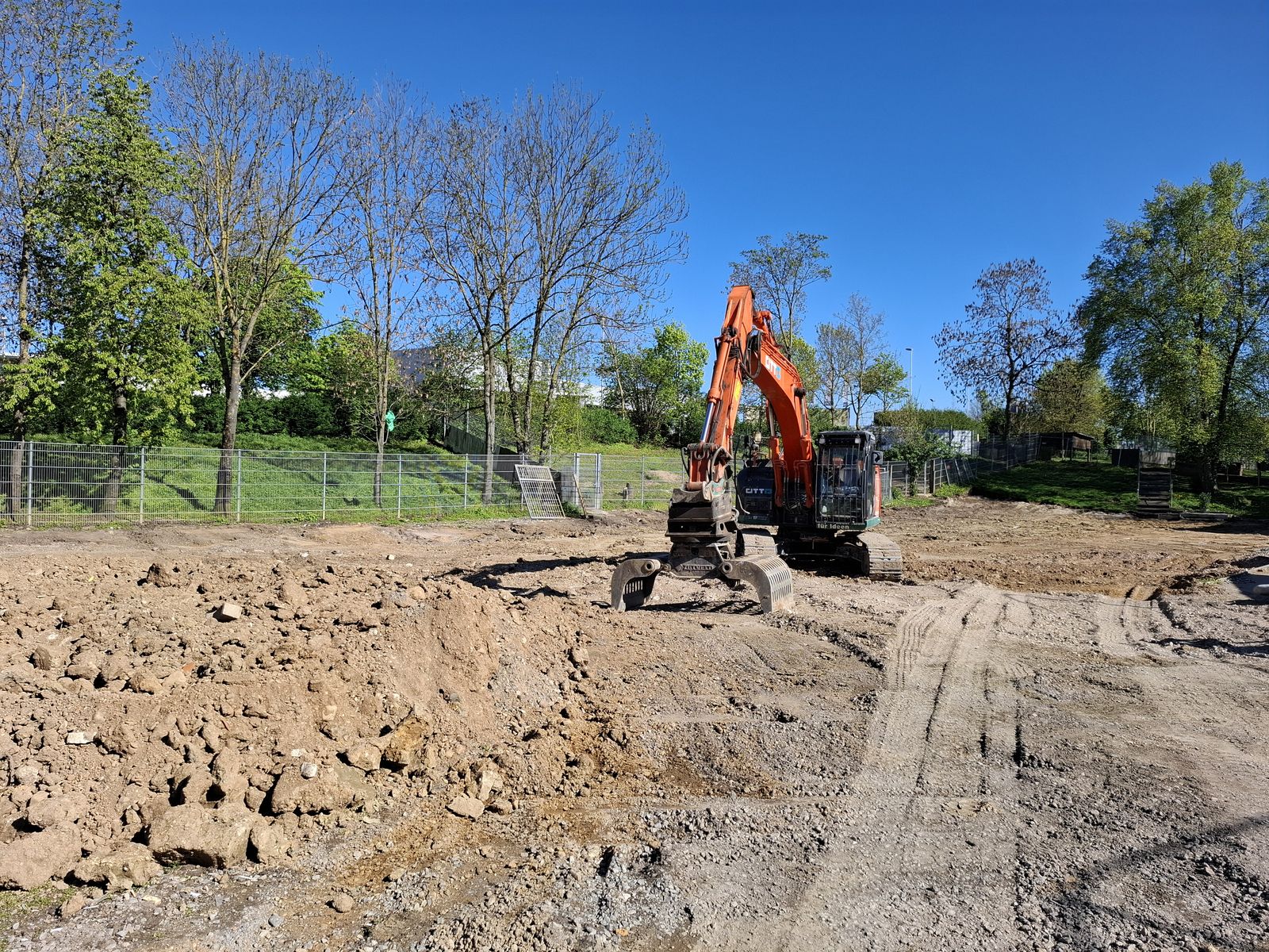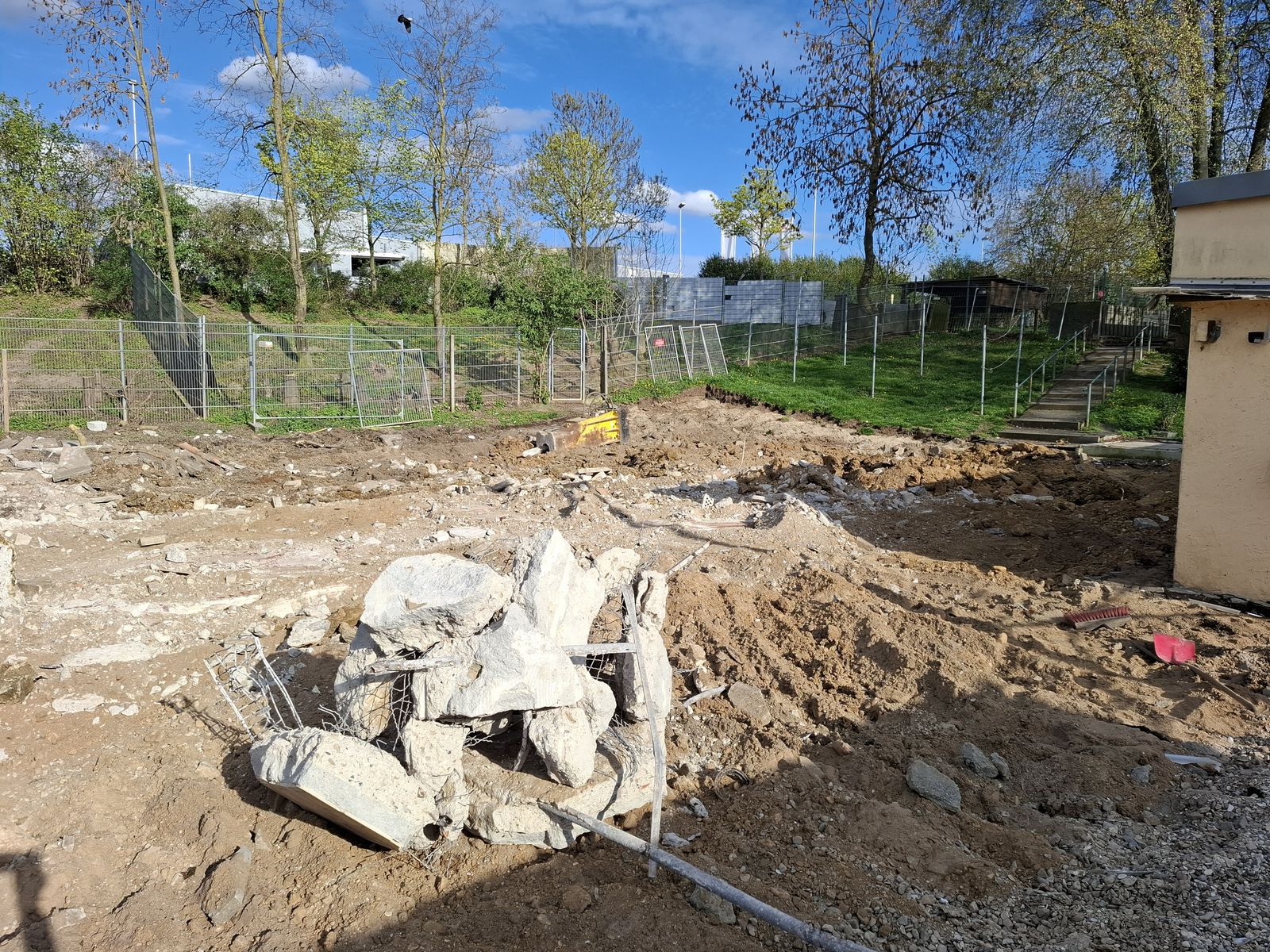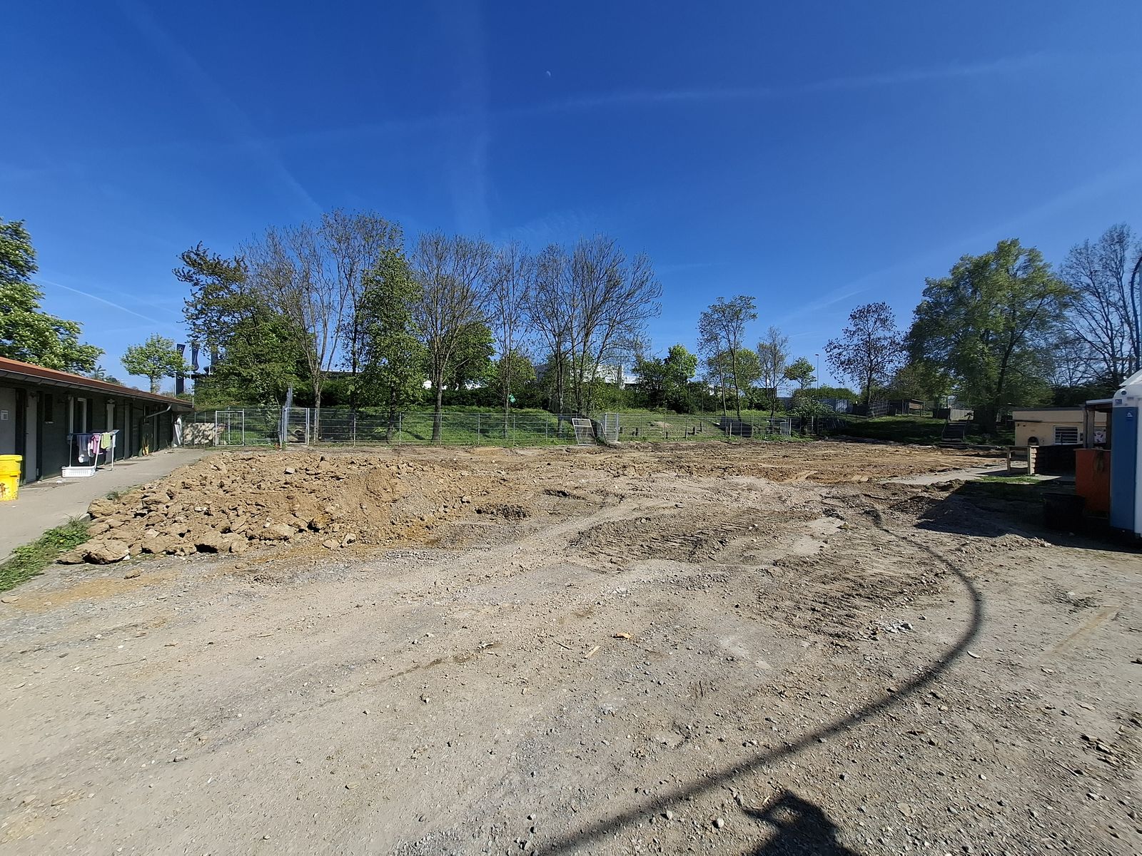 Am heutigen Donnerstag Morgen wurde der Bagger abgeholt, der uns die letzten drei Wochen begleitete. Der fehlende Bagger zeigt uns nun eine riesige frei gewordene Fläche, die ab der nächsten Woche durch ein neues Bauunternehmen für den Neubau vorbereitet wird.