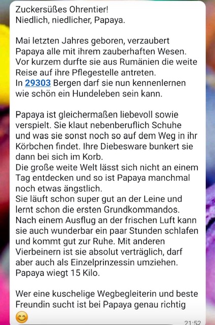 Die aus dem rumänischen Tierschutz gerettete, sehr liebe Mischlingshündin Papaya ist eine noch junge Dame (05/2025) und sucht ein liebevolles Zuhause. Nähere Informationen entnehmen Sie bitte den Beschreibungen bei den Fotos.
