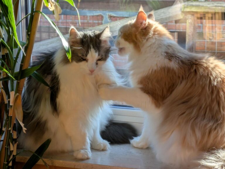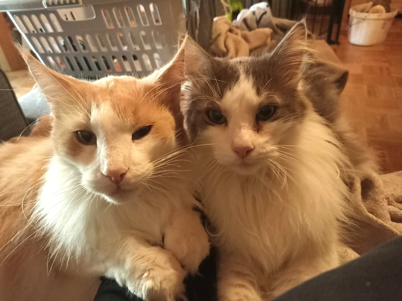 Die beiden wunderschönen Halbbrüder Nanouk (rot-weiß) und Robby (grau-weiß) suchen gemeinsam ein neues Zuhause. Beide sind reinrassige norwegische Waldkater. Nanouk ist 13 Jahre alt, Robby 12,5 Jahre. Die beiden hängen sehr aneinander und werden daher nur zusammen abgegeben. Sie sind sehr verschmust, anhänglich und sanft, da gibt es kein Hauen, Kratzen und Beißen. Wenn ihnen eine Situation zuviel wird, gehen sie weg 🫶🏻.